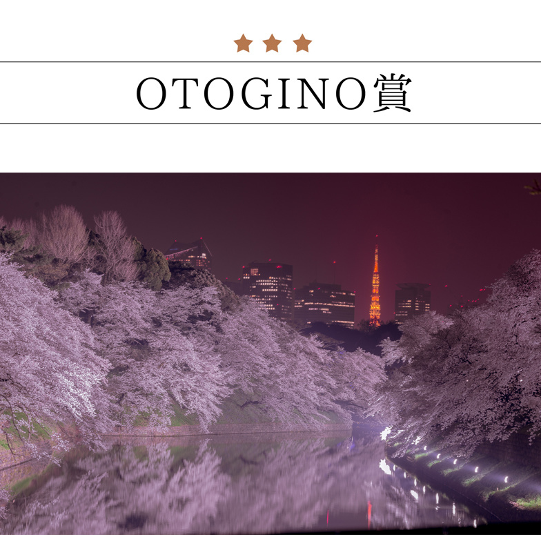 本年、応募数714点の中から栄えあるOTOGINO賞に選ばれたのは、夜のお濠を舞台にした「東京タワーと桜」(撮影者 藤井孝仁さん)。ライトアップされた幻想的な桜と東京タワーとのコントラストが圧倒的に美しく、誰もがこの地を訪れたくなる素晴らしい作品です。受賞者の藤井さんには、「強炭酸水クオス1年分」の目録が手渡されました。協賛は、ホテルニューオータニ、帝国ホテル、靖国神社ほか35法人。応募作品から、グランプリ、千代田区長賞など78点が入選しています。