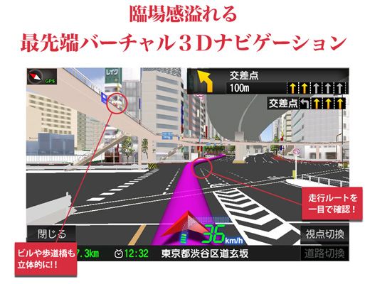 最先端技術「バーチャル3D」を搭載した当商品は、ナビゲーションシステムに(全国21都市)のリアルな街並みを再現。従来品の、地図が立体的に見えるだけの3D静止画の表示から大きく進歩し、提供エリア内(都市単位)であれば常に「バーチャル3D」でナビゲーションします。ビルの窓、標識、お店の看板、並木など実際の世界を細かく忠実に再現したRoadQuest【RQ-E714C】をお楽しみください。