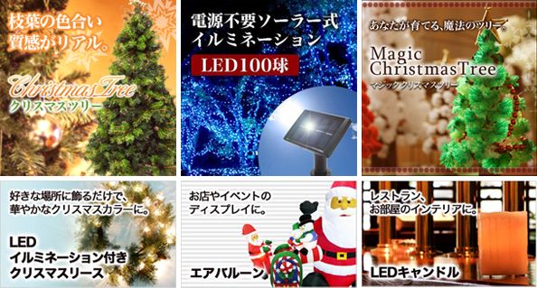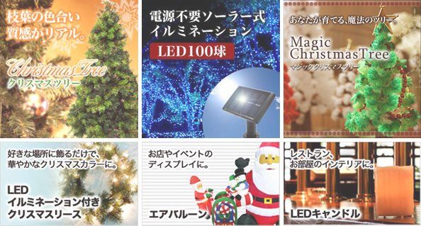 クリスマスツリーは、今人気のファイバーツリーや、自分で発光パターンが作れるアートファイバーツリーなど、定番のクリスマスツリーから、少し違うタイプのクリスマスツリーまであり、LEDを使用したイルミネーションは、ストレートタイプ、ロープタイプ、つららタイプ、ネットタイプ、カーテンタイプ、ソーラー充電式タイプとバリエーション豊富に揃えております。