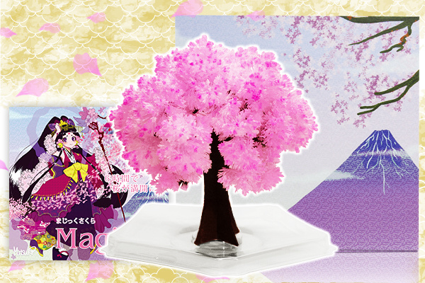 紙で出来た木に魔法の水をかけると、わずか6時間で咲く不思議な桜です。1~2時間後から徐々に先始め約6時間後には満開の桜に。咲いた後は徐々に散っていきます。自分で育てる喜びと、満開の桜を楽しみ、散る儚さまで感じることができます。木花咲耶姫ver.は桜や水の神ともされている木花咲耶姫、日本神話に登場する女神「木花咲耶姫(コノハナサクヤヒメ)」をモチーフに、イラストは京都造形芸術大学の吉田光希氏に描いて頂き、このパッケージが完成しました。