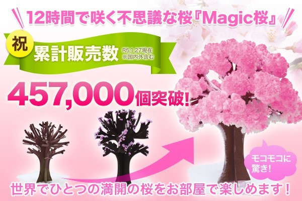 マジック桜はシリーズ累計販売数457,000個を突破、(2023/1/27現在、国内外含む)年々桜のおもちゃのインテリアとして人気がでています。Youtubeやインスタグラムでマジック桜の紹介されるコンテンツ数も近年増えており、Youtubeでは特にヨーロッパの方でマジック桜の咲く様子の動画が多く紹介されています。