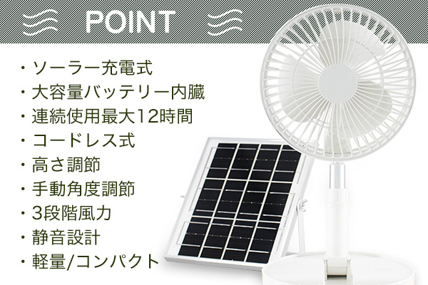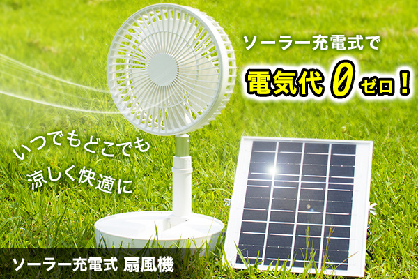 「ソーラー充電式扇風機」は、太陽光で充電ができるので電源がない場所でも長時間の使用が可能です。