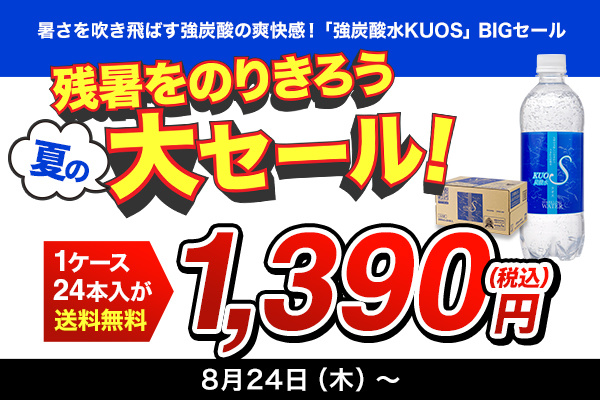 お盆を過ぎましたが全国的にも猛暑日が続き、厳しい残暑となりました。そんな残暑の疲れを吹き飛ばしてもらおうと大人気の強炭酸水KUOSプレーンの『残暑をのりきろう!大セール』24本で1,390円(税込)を期間限定で実施中です。