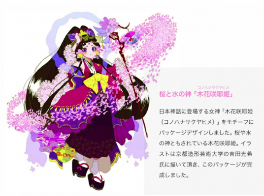 木花咲耶姫ver.は桜や水の神ともされている木花咲耶姫、日本神話に登場する女神「木花咲耶姫(コノハナサクヤヒメ)」をモチーフに、イラストは京都造形芸術大学の吉田光希氏に描いて頂き、このパッケージが完成しました。