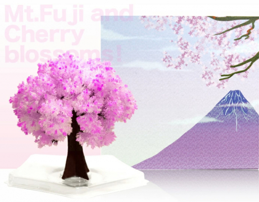 紙で出来た木に魔法の水をかけると、わずか6時間で咲く不思議な桜です。1~2時間後から徐々に先始め約6時間後には満開の桜に。咲いた後は徐々に散っていきます。自分で育てる喜びと、満開の桜を楽しみ、散る儚さまで感じることができます。
