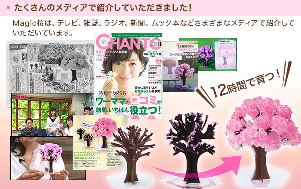 魔法の水をかけるだけで、約12時間後には満開の桜が広がる様子は、まるで魔法のよう。その魅力は、多くのテレビやラジオ、雑誌などのメディアでも紹介されるほど話題に!