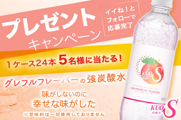 キャンペーン期間中に応募された方の中から抽選で、5名様にKUOSシリーズ『強炭酸水KUOSグレープフルーツフレーバー』をプレゼントします。