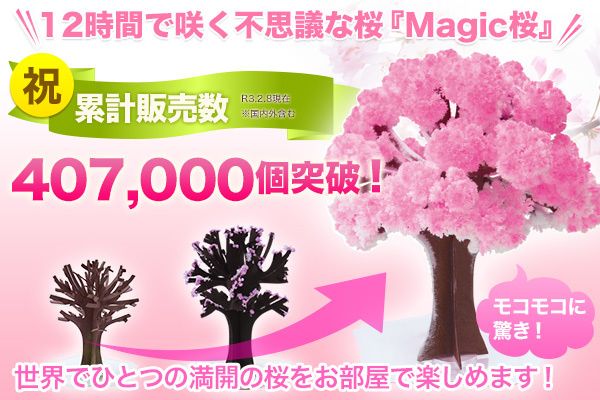 株式会社OTOGINO(オトギノ:代表取締役社長 鬼武公洋 本社 大分県日田市北友田 2 丁目 2123 番地 1)がE-コマースにて販売中の12時間で咲く不思議な桜『マジック桜』が、シリーズ累計販売数407,000個を突破しました。(2021/2/8現在、国内外含む)