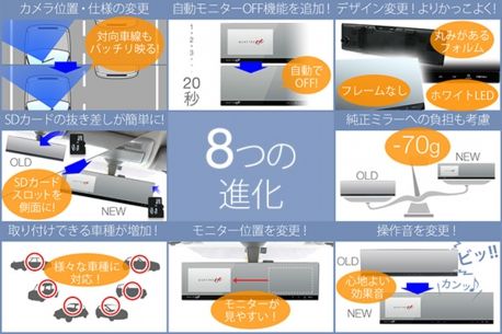 今回、ルームミラー型ドライブレコーダーの"新製品開発"にあたり、旧タイプを販売した約3年の間に寄せられた購入者様からのご意見ご要望を整理し、メーカーの協力のもと約1年の開発期間をかけ、全8項目の製品改良を行いました。