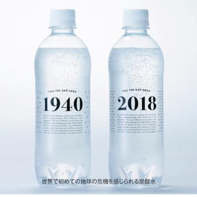 株式会社 OTOGINO(オトギノ:社長 鬼武公洋 本社 大分県日田市北友田 2 丁目 2123 番地 1)はグルーンピープルズパワーが空気中の二酸化炭素削減のための一環として実施したFEEL THE GAP SODAキャンペーン(2018年実施)に炭酸水とボトルの製造で協力しました。1940年と2018年の空気中の二酸化炭素濃度の違いを、炭酸強度の違う2本の炭酸水を製造し表現しました。
