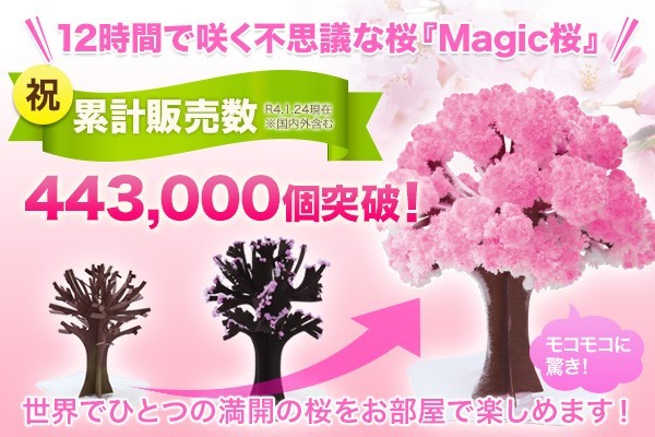 株式会社OTOGINO(オトギノ:代表取締役社長 鬼武公洋 本社 大分県日田市北友田 2 丁目 2123 番地 1)がE-コマースにて販売中の12時間で咲く不思議な桜『マジック桜』が、シリーズ累計販売数443,000個を突破、昨年2月時点で年間12,000個の売り上げから今年度1月時点で年間36,000個の3倍の売り上げを更新しました。(2022/1/24現在、国内外含む)